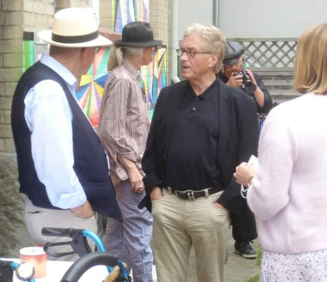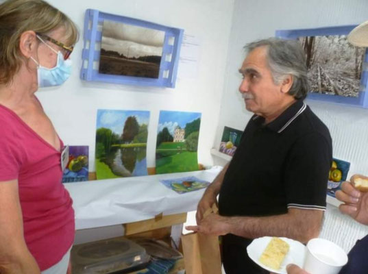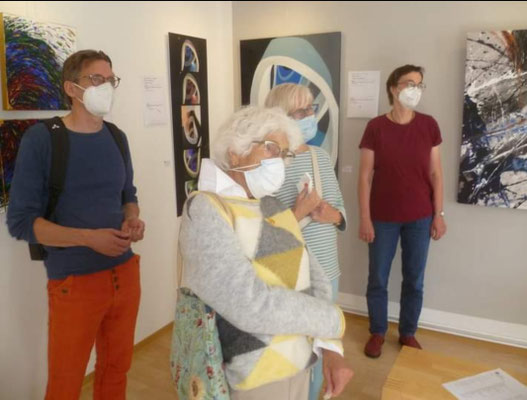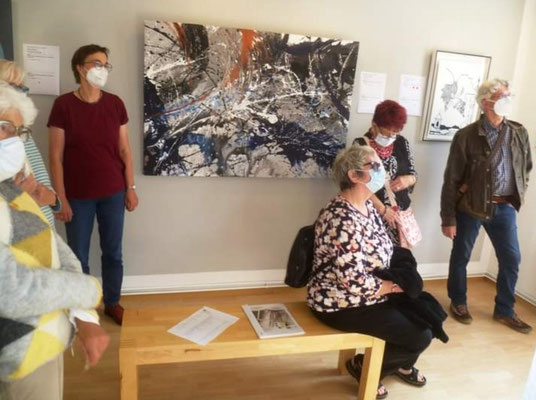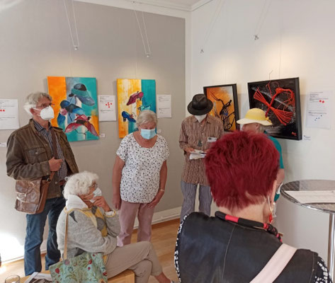 Um 16 Uhr gab es eine Führung durch die Jahresausstellung „AusGefallen“ des Vereins. Alle beim Sommerfest Anwesenden hatten die Möglichkeit, die Ausstellungsbilder mit roten und blauen Punkten zu