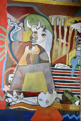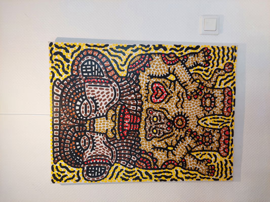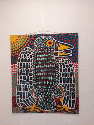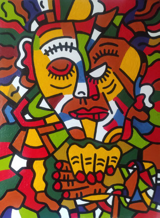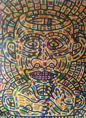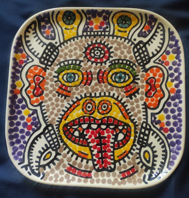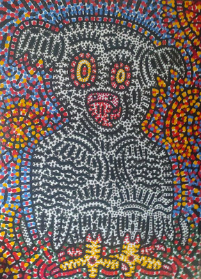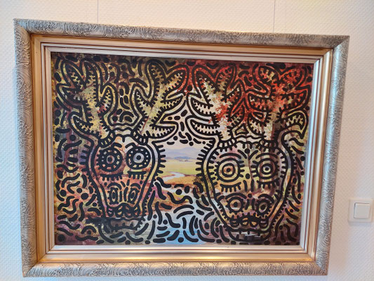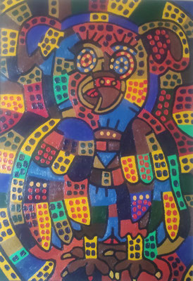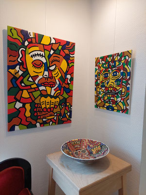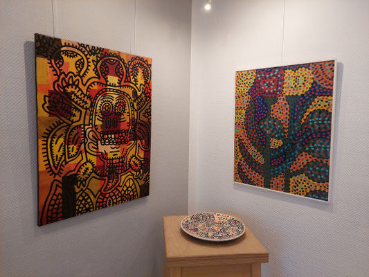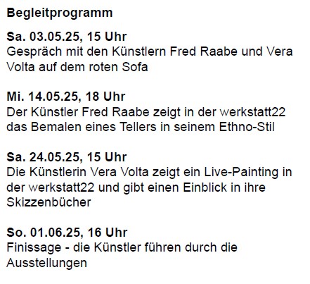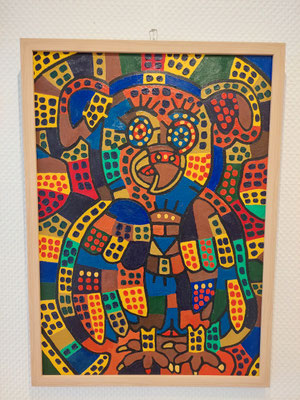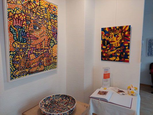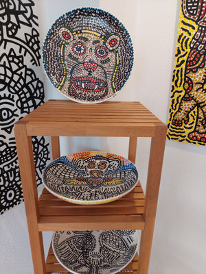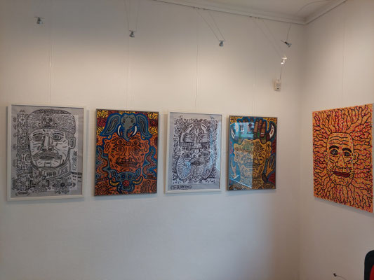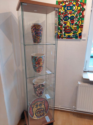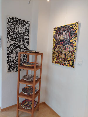 Fred Raabe zeigt Alternative Kunst: Bilder und Zeichnungen von Göttern, Menschen und Tieren; außerdem bemalte Keramik-Gegenstände (Teller, Schalen und Vasen) sowie auch T-Shirts im ganz persönlichen "Ethno-Stil".