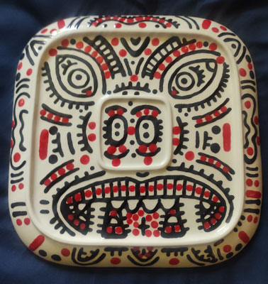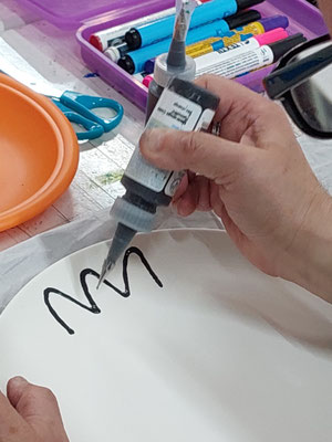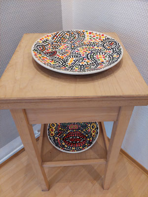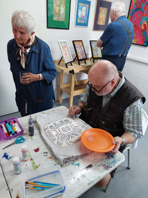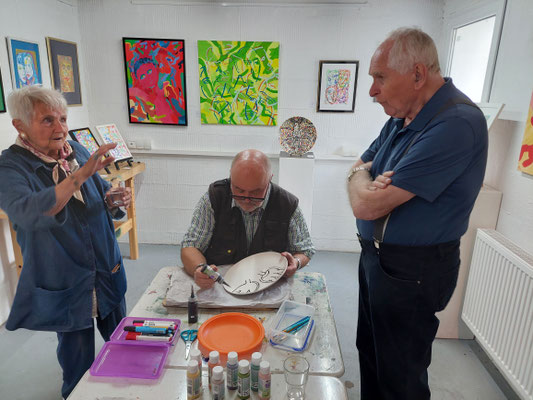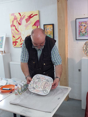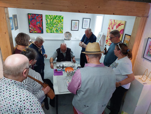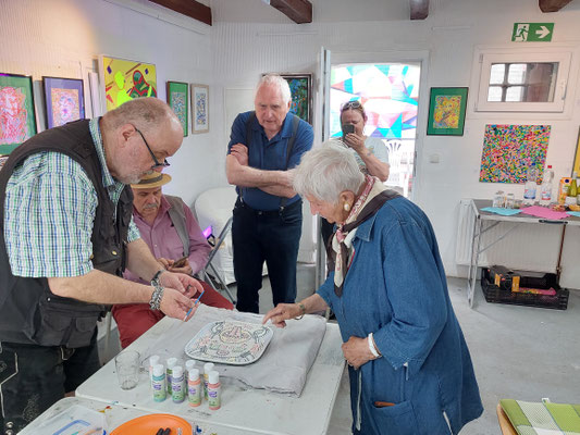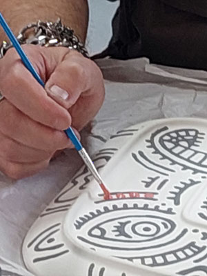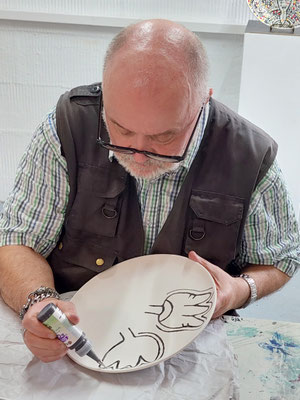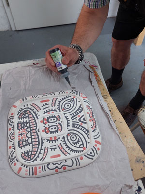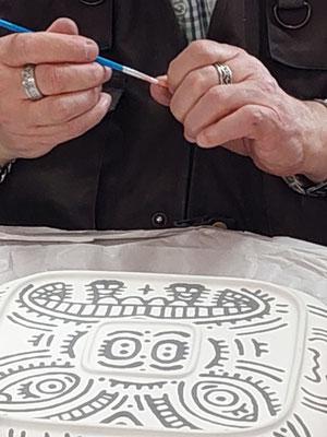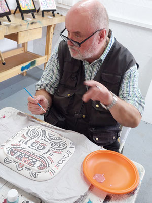 Fred Raabe zeigt in der werkstatt22 das Bemalen eines Tellers in seinem Ethno-Stil.