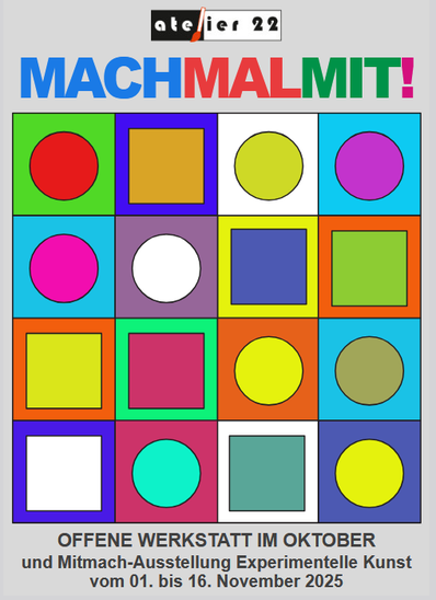 Unter dem Motto MACHMALMIT! steht die Werkstatt vom 1.10. bis 31.10.25 offen für die Entstehung von Gemeinschaftskunst und experimenteller Kunst aus diversen Materialien und in verschiedenen Techniken.